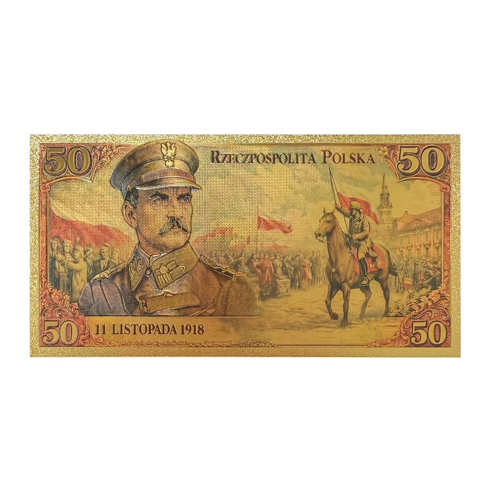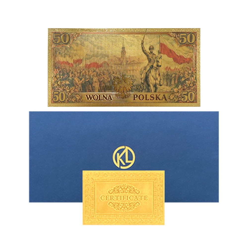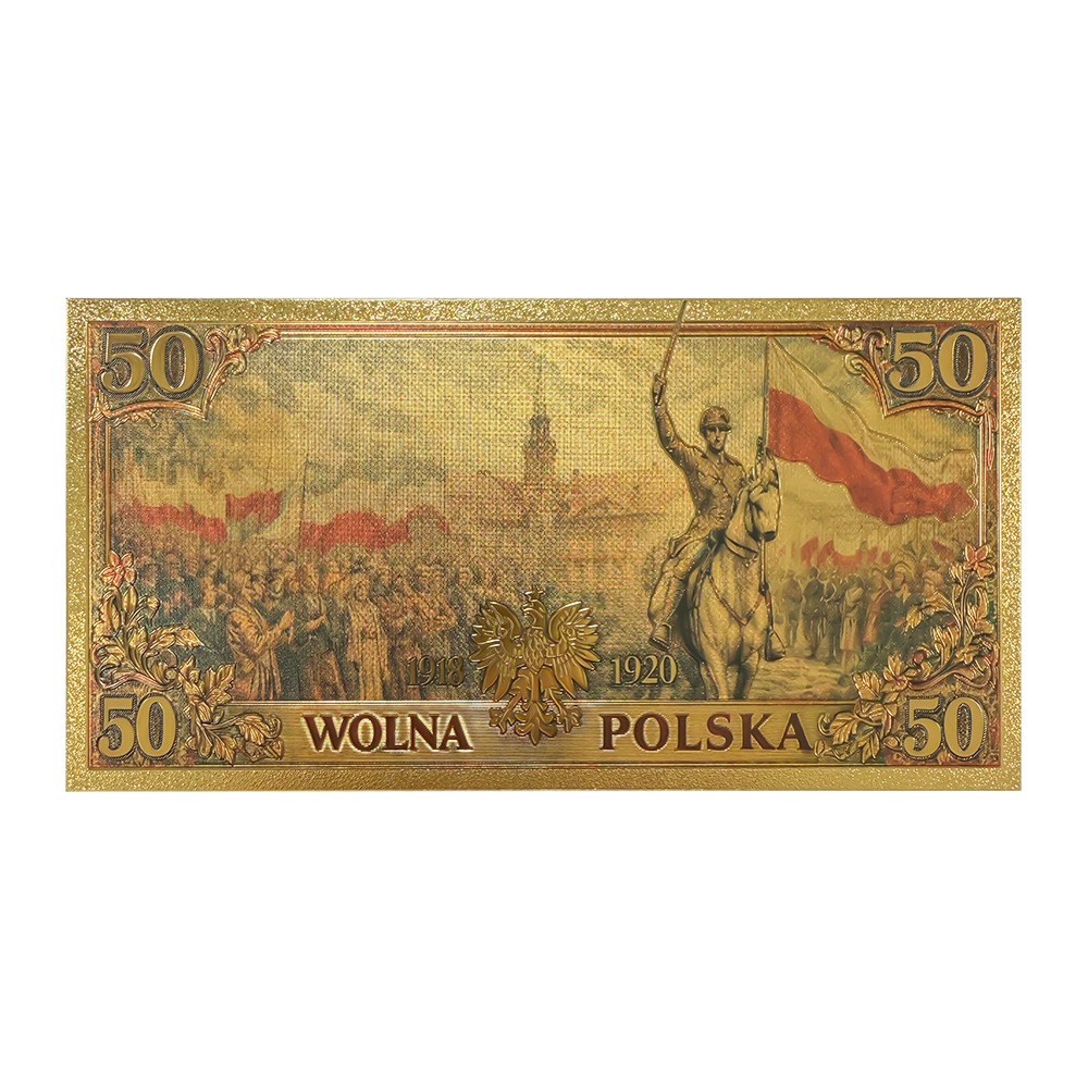 Ten ekskluzywny, pozłacany banknot kolekcjonerski o nominale 50 to wyjątkowy hołd dla odzyskania przez Polskę niepodległości oraz zwycięstwa w wojnie polsko-bolszewickiej. To symbol triumfu, jedności narodowej i dumy z odrodzonej Rzeczypospolitej.