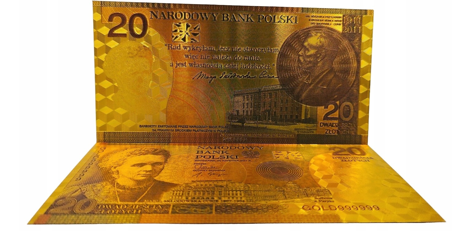 Banknot kolekcjonerski 20 zł Maria Skłodowska Curie, pozłacany.