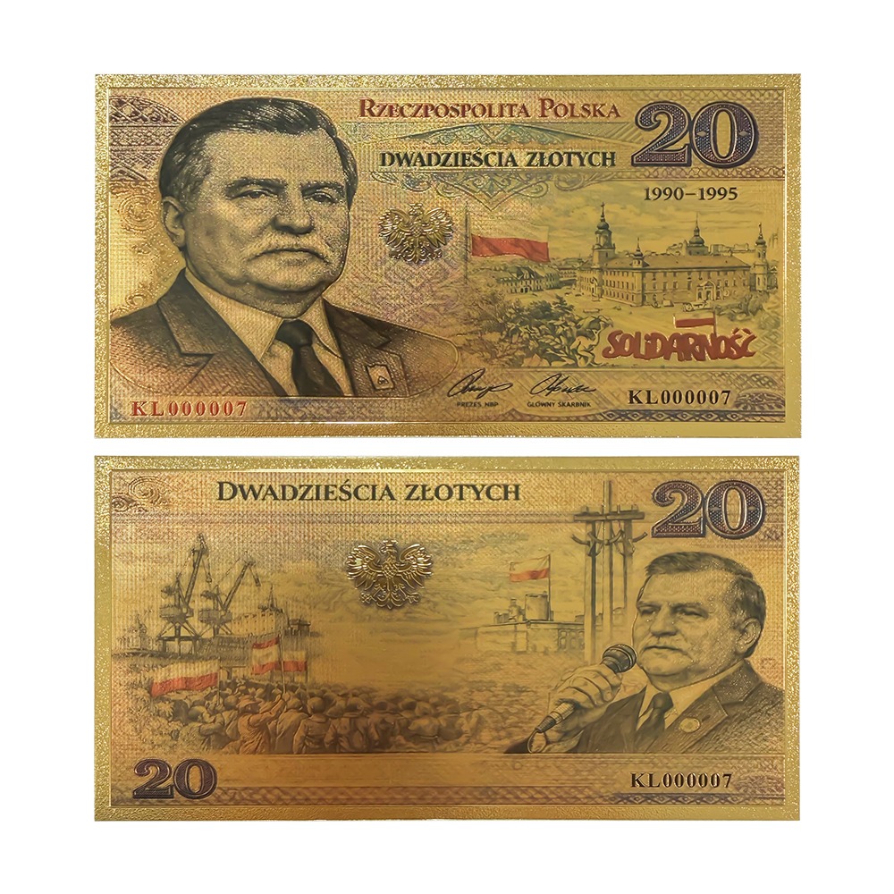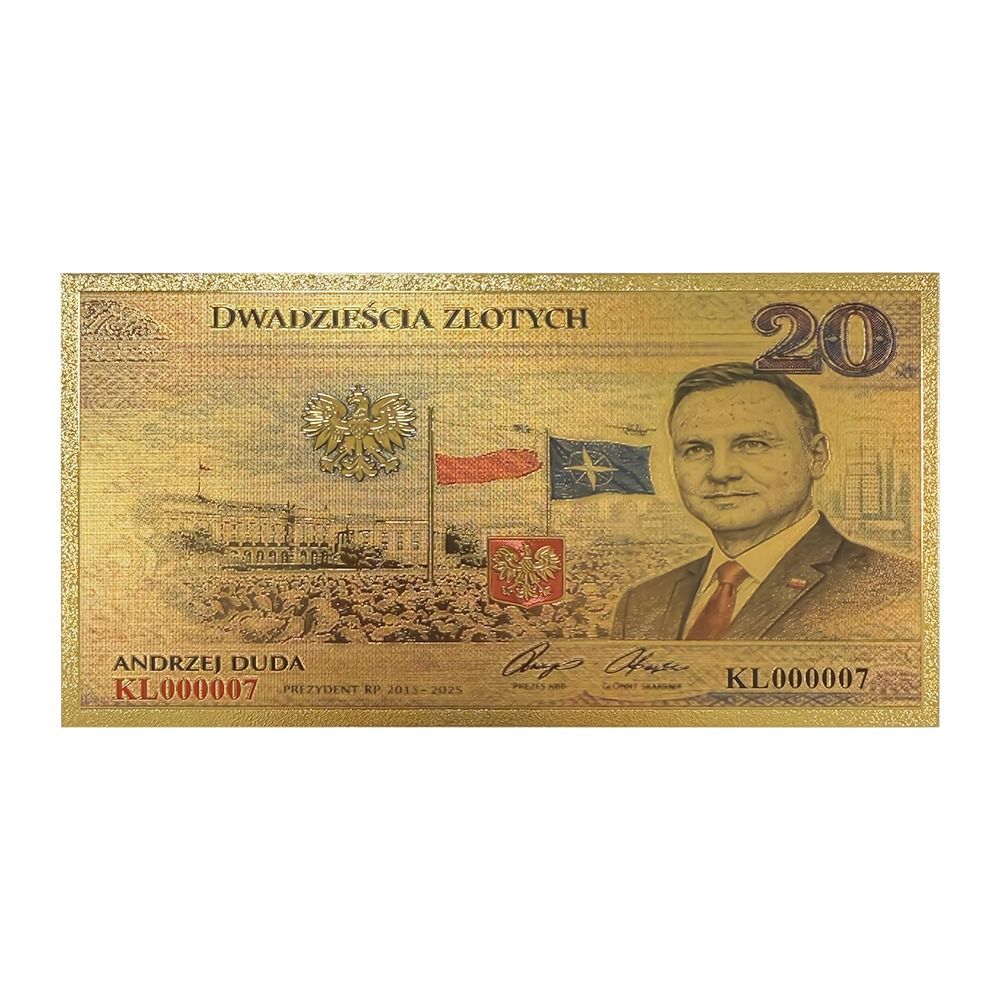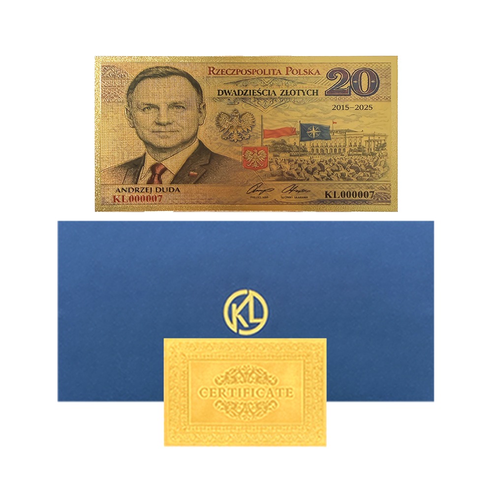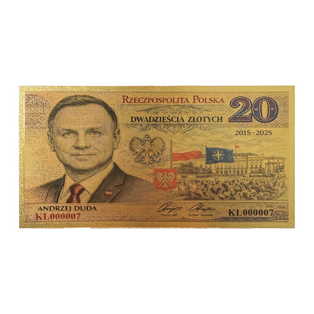 Elegancki, pozłacany banknot kolekcjonerski upamiętniający dwie kadencje prezydentury Andrzeja Dudy (2015–2025). Złota kolorystyka, precyzyjne detale oraz reprezentacyjna kompozycja nadają mu podniosły, państwowy charakter.