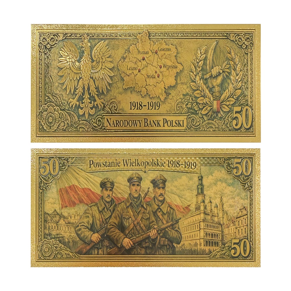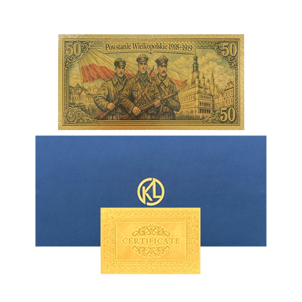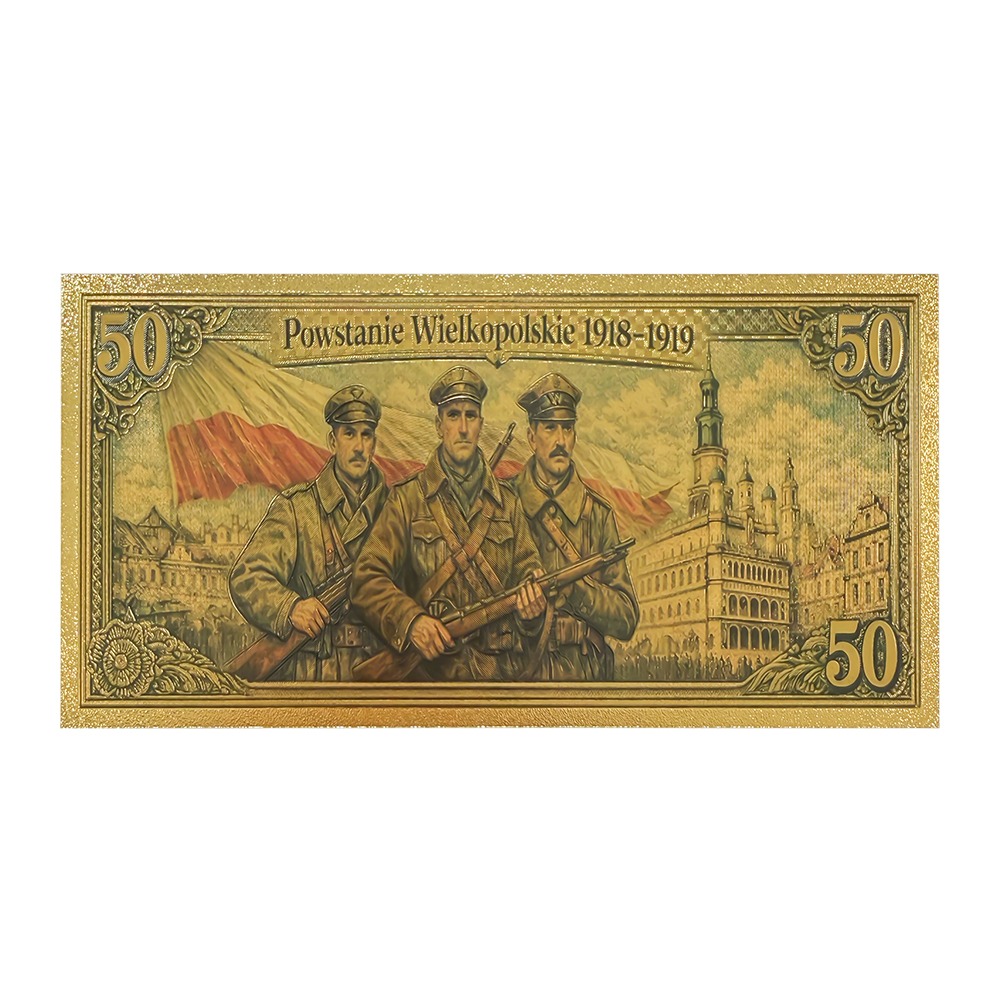 Ten pozłacany banknot kolekcjonerski o nominale 50 to wyjątkowe upamiętnienie zwycięskiego Powstania Wielkopolskiego 1918–1919 – jednego z nielicznych w historii Polski zrywów zakończonych pełnym sukcesem. To symbol odwagi, skuteczności i determinacji mieszkańców Wielkopolski w walce o powrót do odrodzonej Ojczyzny.
