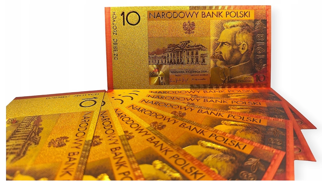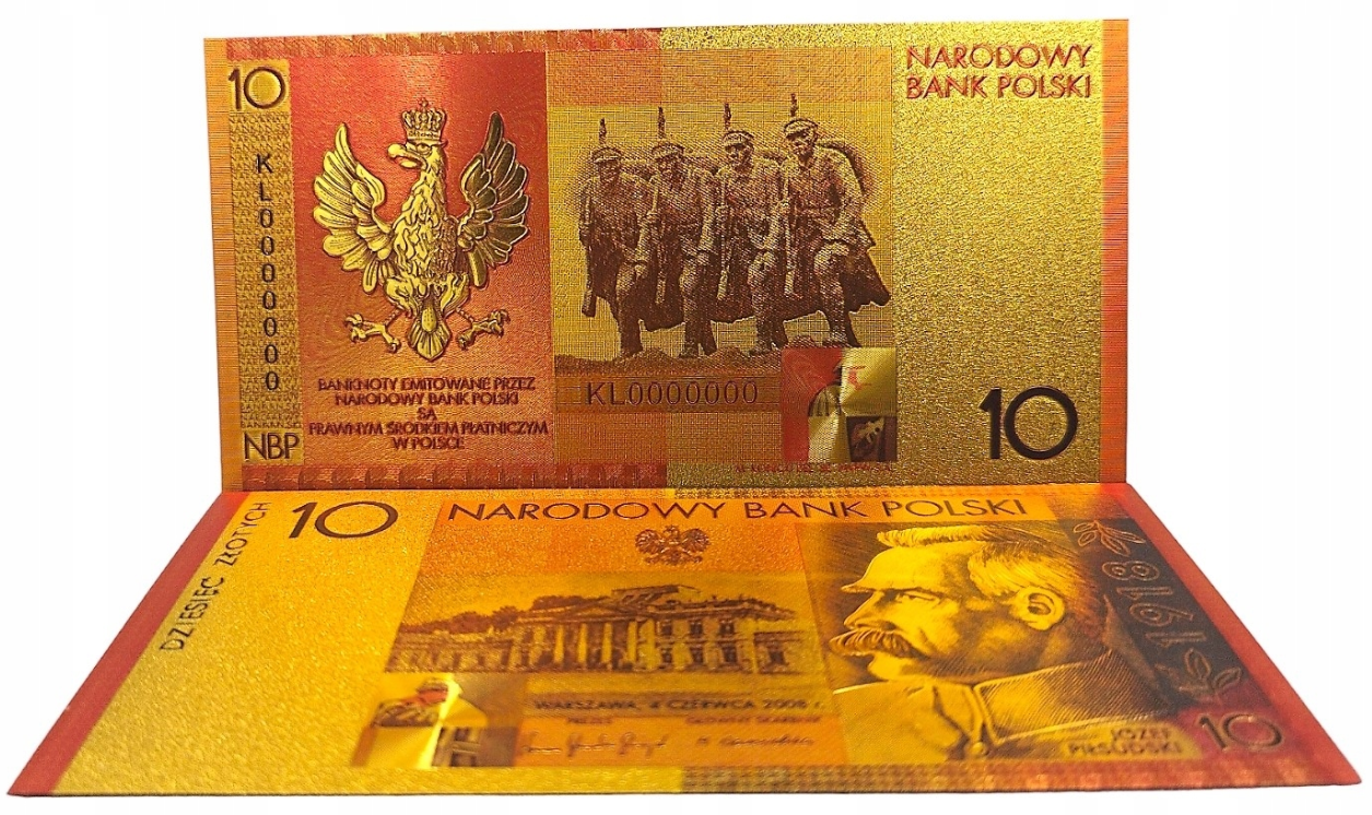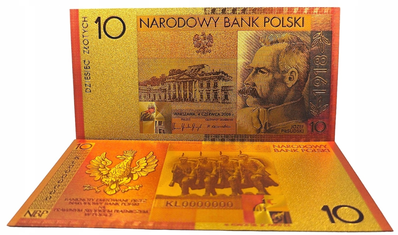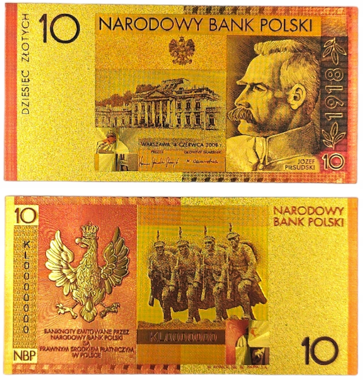 Pozłacany banknot kolekcjonerski 10zł Józef Piłsudski.