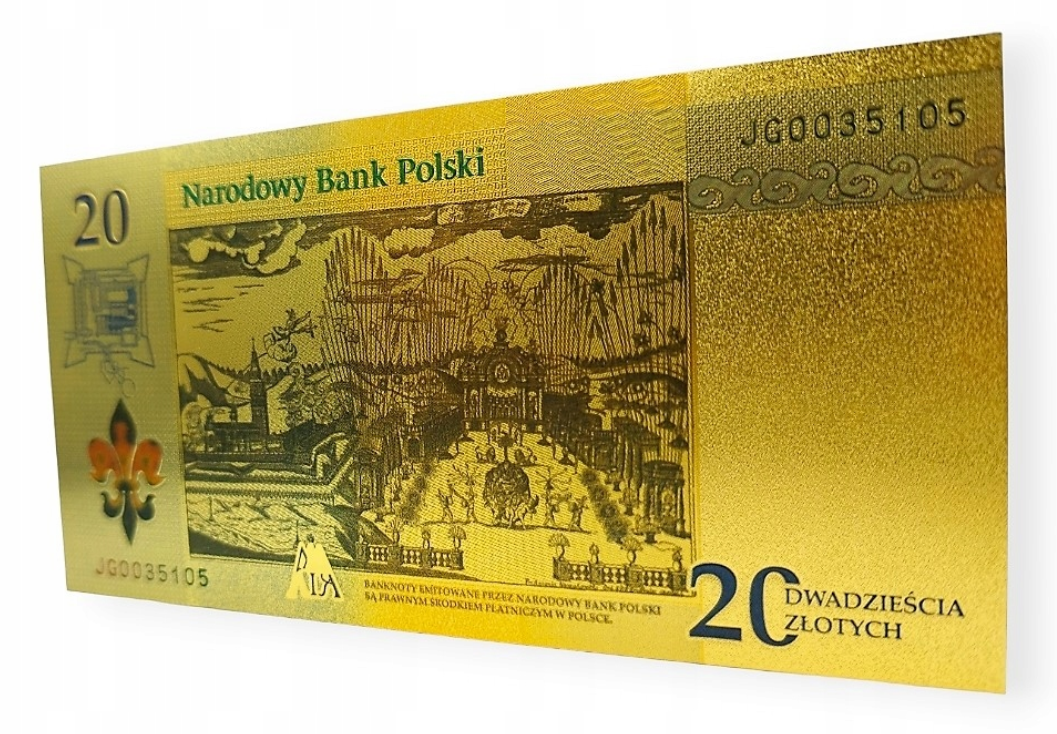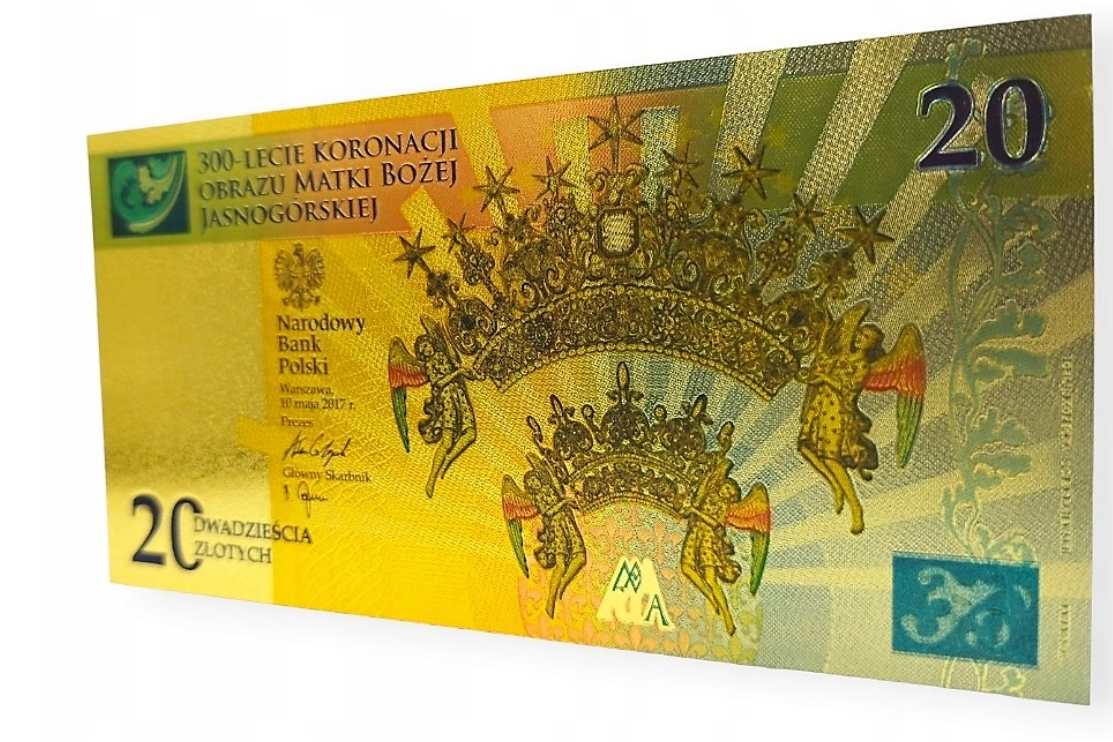 Banknot kolekcjonerski, pozłacany 20 zł. 300 lecie koronacji obrazu Matki Boskiej Jasnogórskiej.