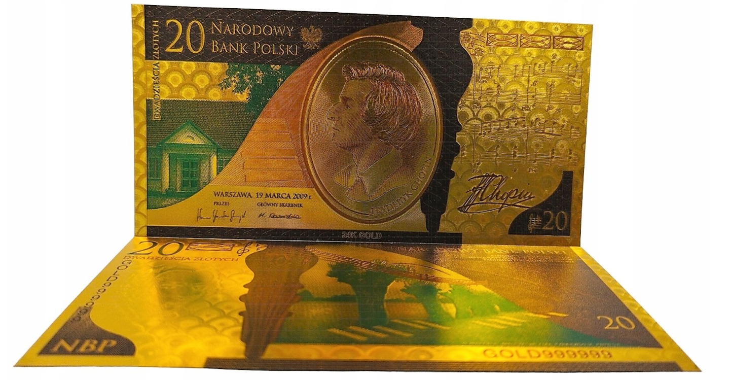 Banknot kolekcjonerski, pozłacany 20 zł. z wizerunkiem Juliusza Słowackiego.