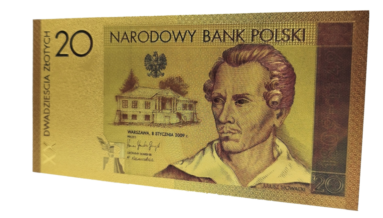 Banknot kolekcjonerski, pozłacany 20 zł. Juliusz Słowacki.