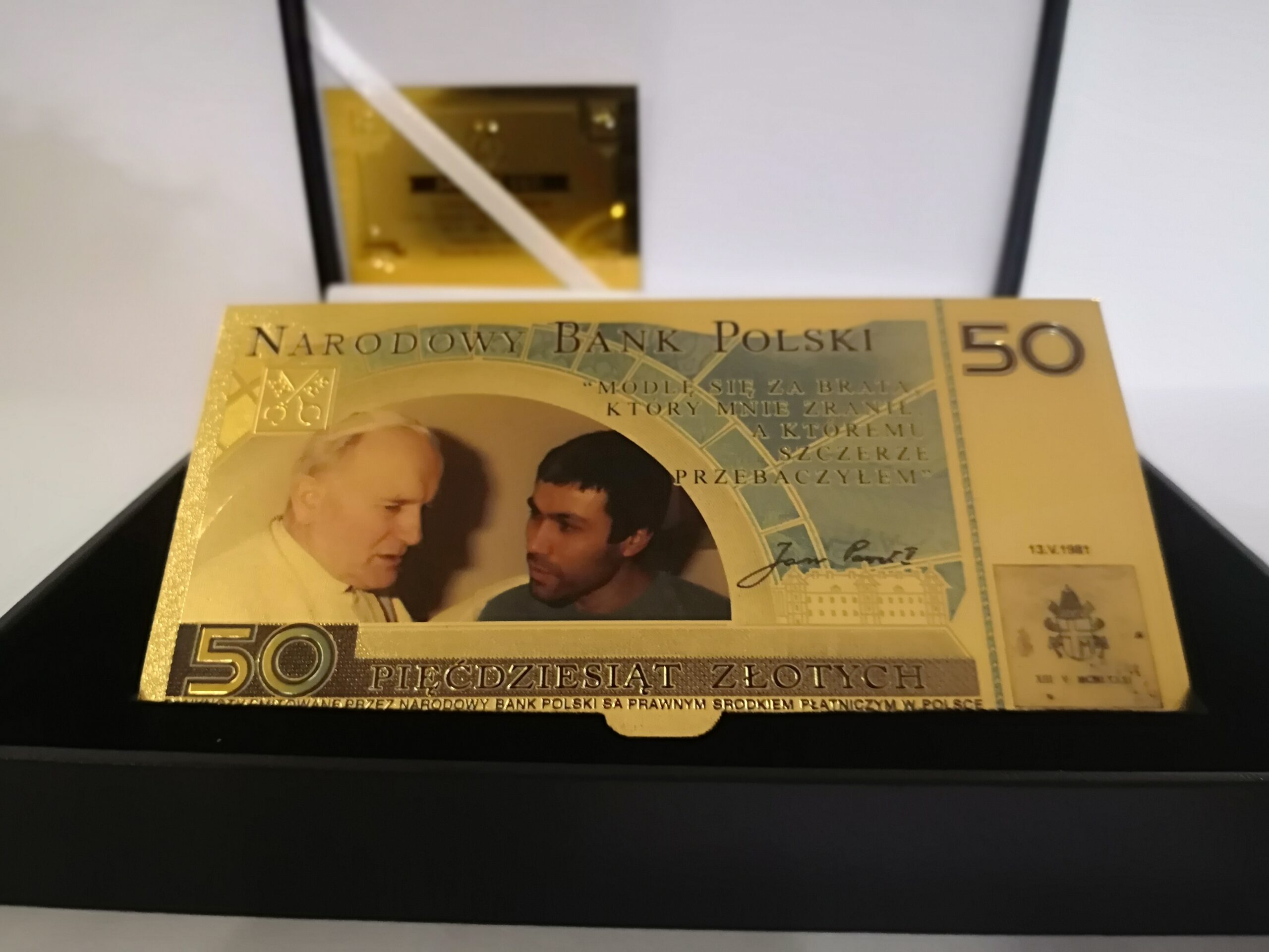 Banknot kolekcjonerski „ZAMACH NA PAPIEŻA” w wersji pozłacanej 24-karatowym złotem.