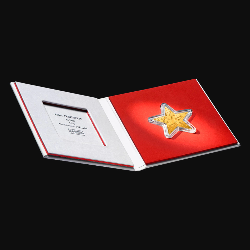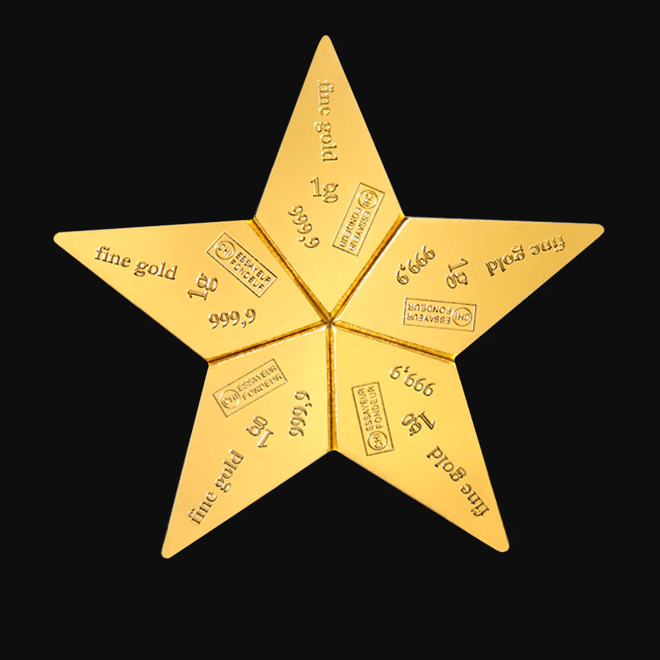Złota sztabka Valcambi CombiBar Star w kształcie gwiazdy, to pięć 1 gramowych sztabek o próbie 999.9 połączone w jeden 5 gramowy produkt.