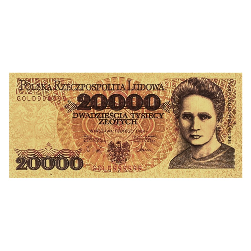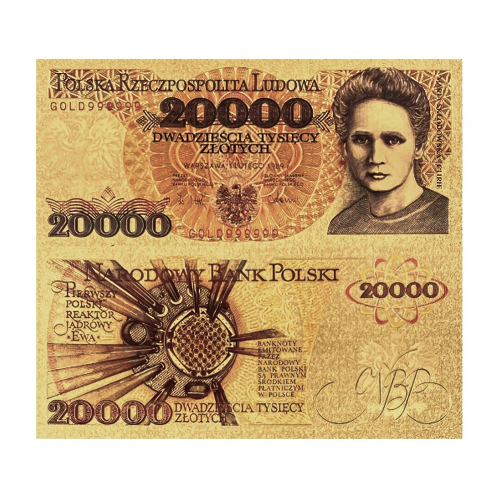 Banknot 20 000 złotych z 1989 roku, emitowany podczas przełomu PRL-u i III RP, przedstawia stylizowane popiersie Marii Skłodowskiej-Curie na awersie i pierwszy polski reaktor nuklearny „Ewa” na rewersie. Na awersie widnieje napis „Polska Rzeczpospolita Ludowa”, a poniżej dwukrotnie nominał „20000” i słownie „Dwadzieścia tysięcy złotych”. Na rewersie znajduje się „Narodowy Bank Polski” u góry, a w rogach i za nominałem „20 000” powtarzany jest napis