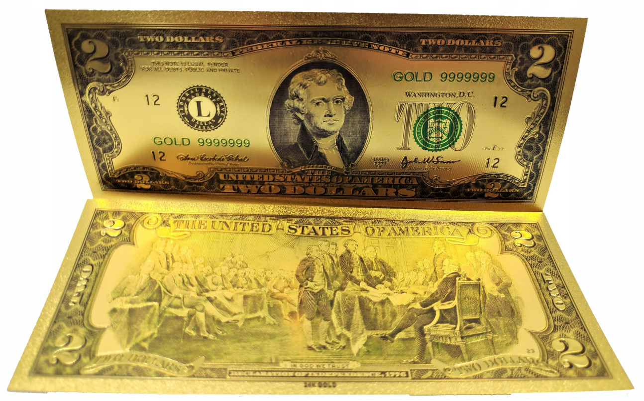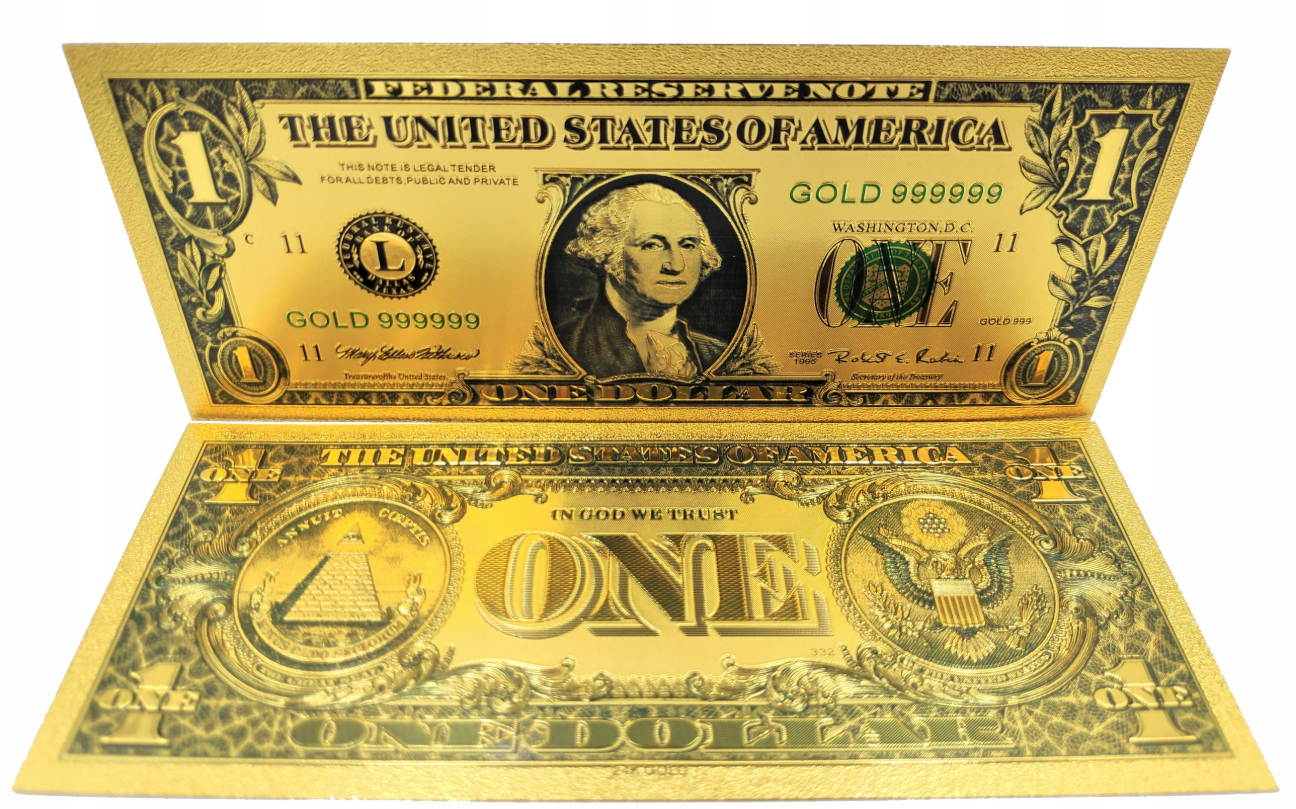 Pozłacany, kolekcjonerski banknot 1 dollar.