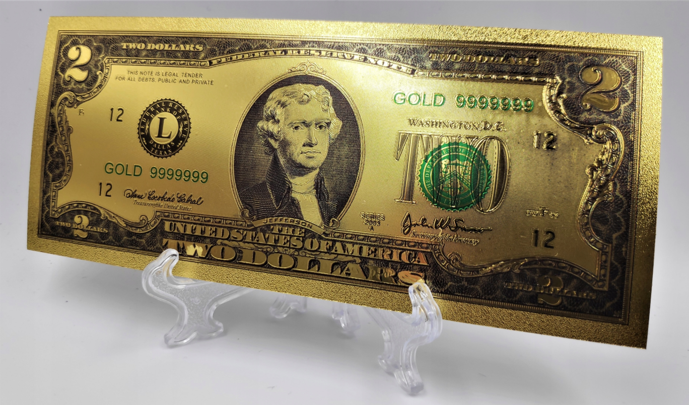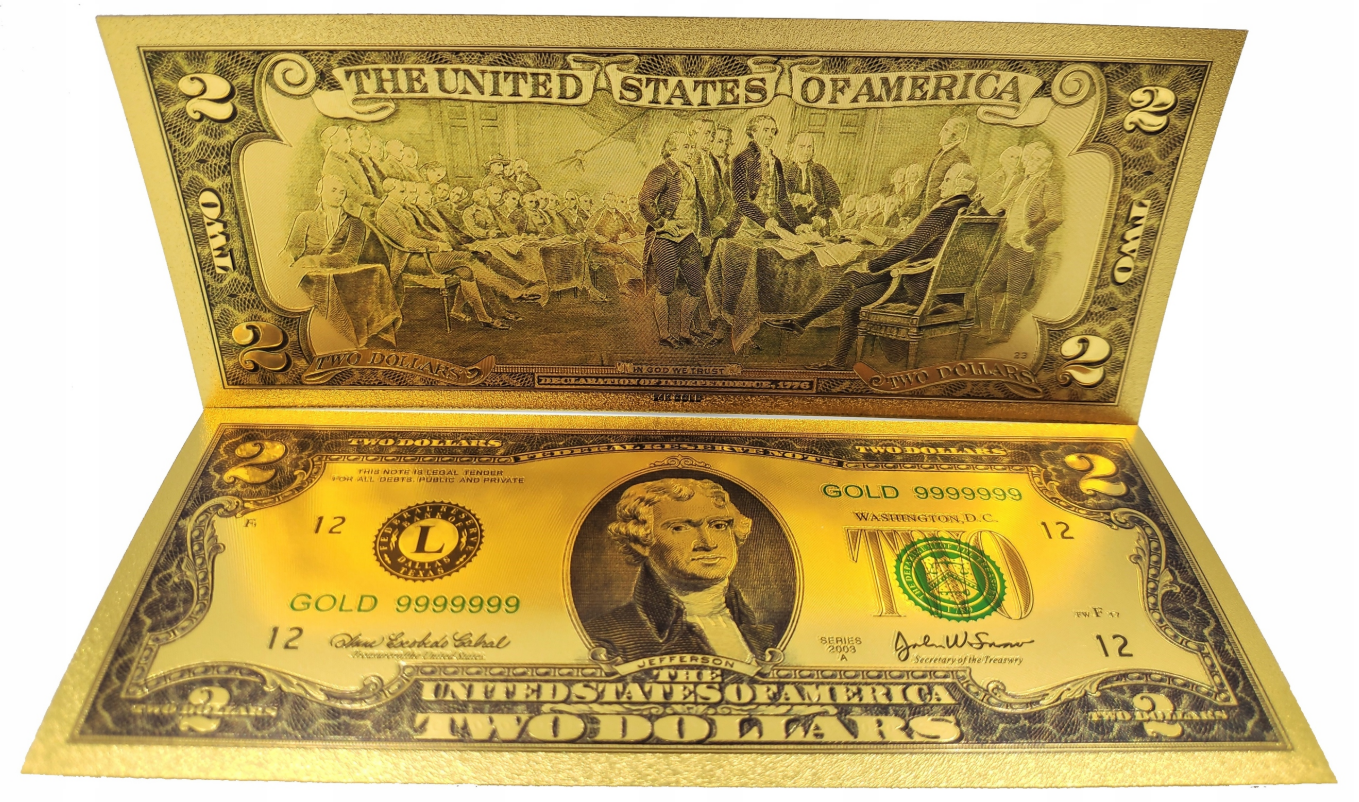Pozłacany, kolekcjonerski banknot 2 dollars.