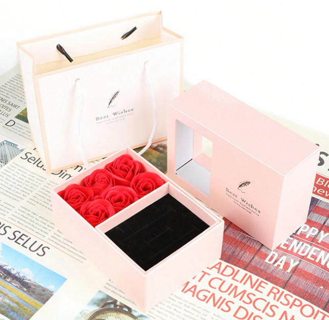 Pudełko prezentowe z sześcioma różyczkami.