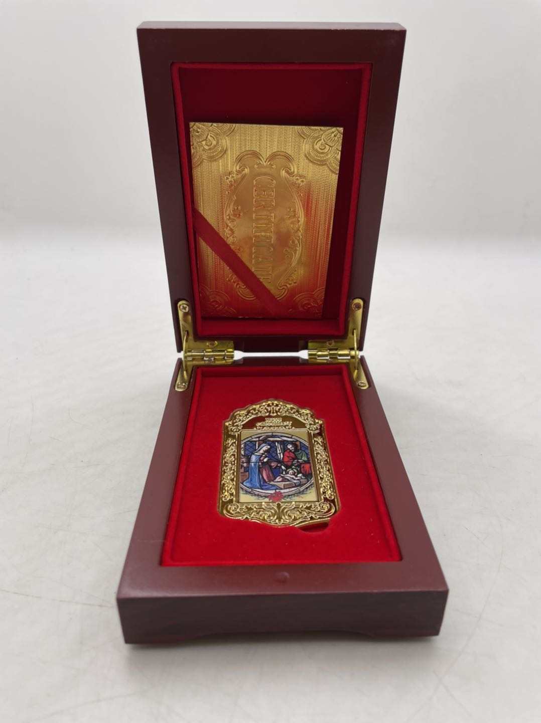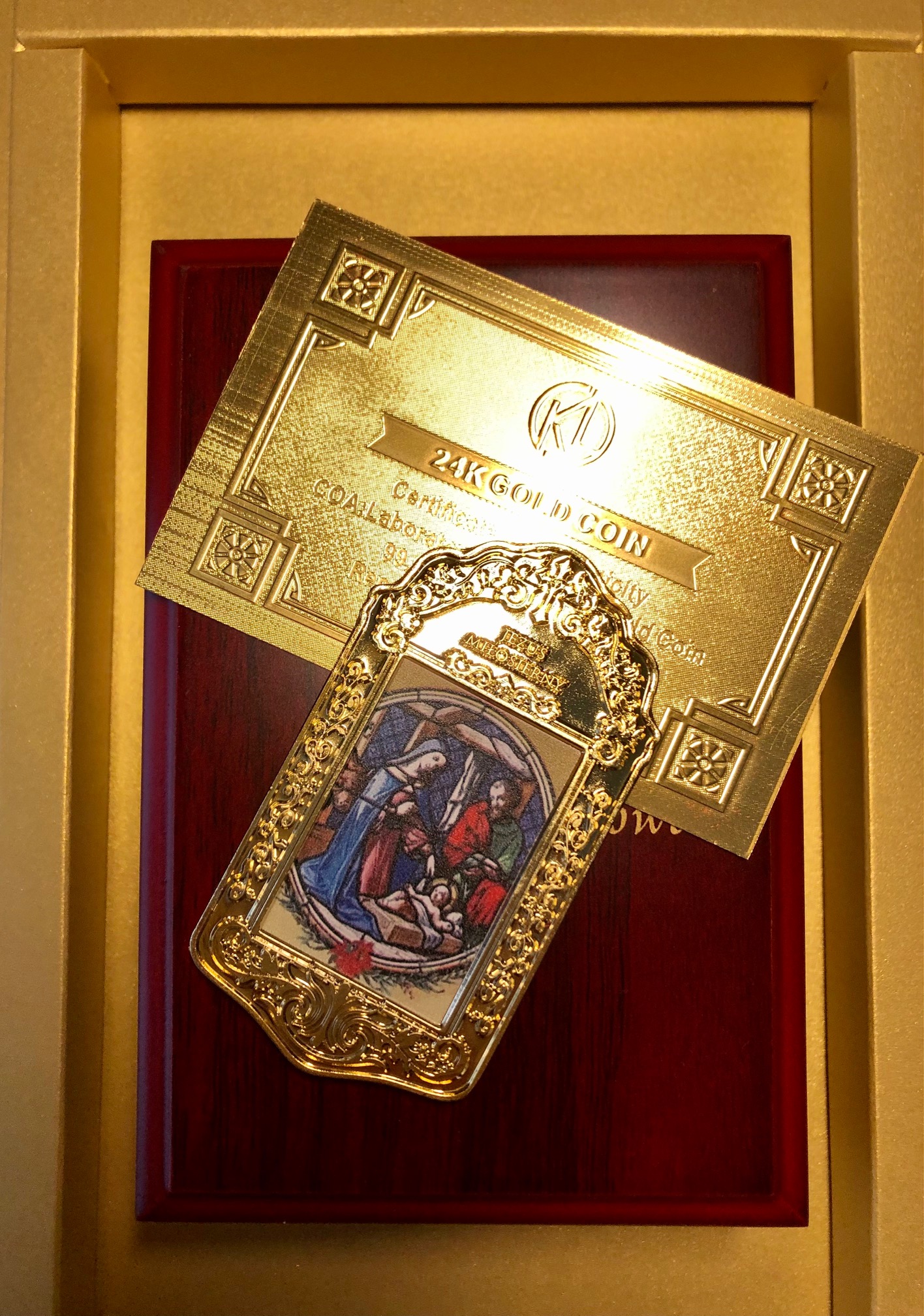 Z tej okazji kolekcje luksusowe wyemitowały niezwykłą sztabkę numizmatyczną w kształcie kunsztownego medalionu platerowaną czystym, 24-karatowym złotem ukazującą rodzinę świętą oraz symbol świąt- choinkę.