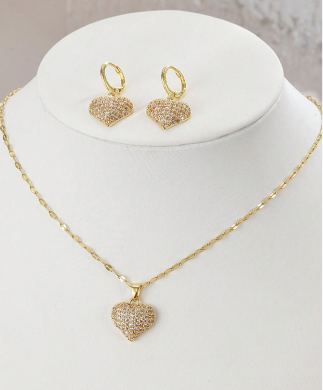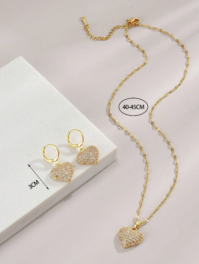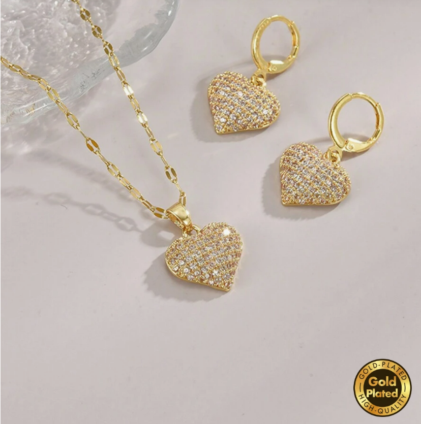 Elegancki zestaw: pozłacana biżuteria z motywem serca, z kryształkami.