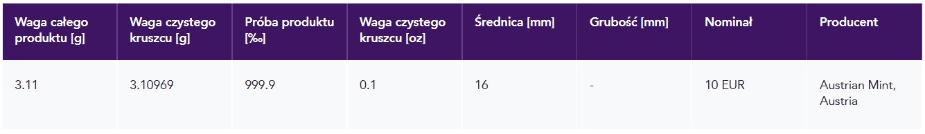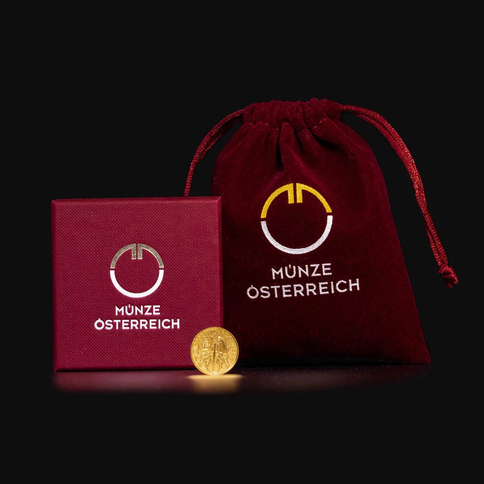 Złoty Wiedeński Filharmonik 1/10 oz zawiera 3,11 grama czystego złota, a średnica monety to 16 mm. Dzięki bezpośredniej współpracy z Münze Österreich, wprowadziliśmy do oferty limitowaną edycję prezentową. Zawiera tę samą, doskonale znaną inwestorom i kolekcjonerom monetę Złoty Wiedeński Filharmonik 1/10 oz, ale zapakowana jest dodatkowo w eleganckie, czerwone pudełko z tłoczonym logo producenta oraz czerwony welurowy woreczek z logo Münze Österreich.